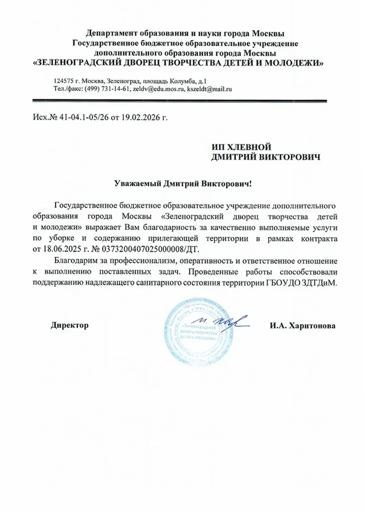 Государственное бюджетное образовательное учреждение дополнительного образования города Москвы «Зеленоградский дворец творчества детей и молодежи» выражает Вам благодарность за качественно выполненные услуги по уборке и содержанию прилегающей территории в рамках контракта от 18.06.2025 г. № 037320040 70025000008/ДТ. Благодарим за профессионализм, оперативность и ответственное отношение к выполнению поставленных задач. Проведенные работы способствовали поддержанию надлежащего санитарного состояния территории ГБОУДО ЗДТДиМ.
