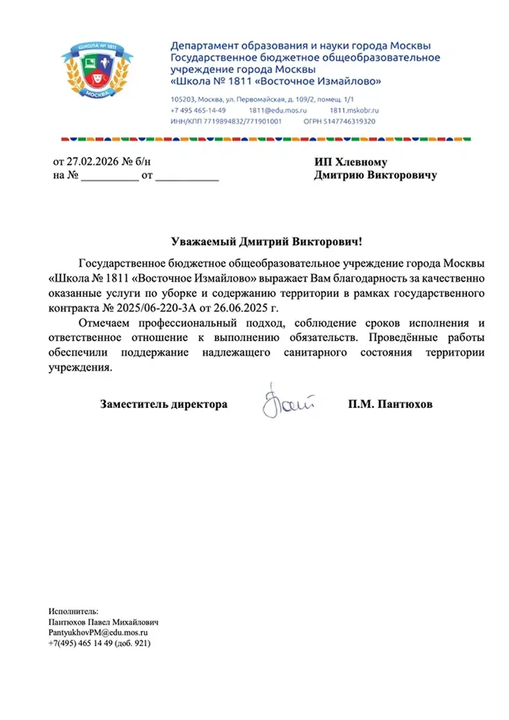 Государственное бюджетное общеобразовательное учреждение города Москвы «Школа № 1811 «Восточное Измайлово» выражает Вам благодарность за качественно оказанные услуги по уборке и содержанию территории в рамках государственного контракта № 2025/06-220-3А от 26.06.2025 г. Отмечаем профессиональный подход, соблюдение сроков исполнения и ответственное отношение к выполнению обязательств. Проведённые работы обеспечили поддержание надлежащего санитарного состояния территории учреждения.